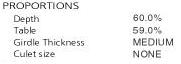 Proportions: describes several characteristics relating to the diamond cut. Depth: for round diamonds the depth is relative to the average diameter, and for fancy shapes it’s relative to the width. Table: the average size of the table facet in relation to the average diameter for round diamonds and to the width in fancy diamonds. Girdle thickness: the thickness of the girdle is relative to the size of the diamond. Culet size: the size of the culet relative to the size of the diamond.