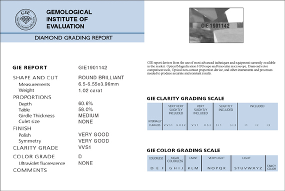 In the diamond certification GIE includes all of the relevant information pertaining to the diamond.
